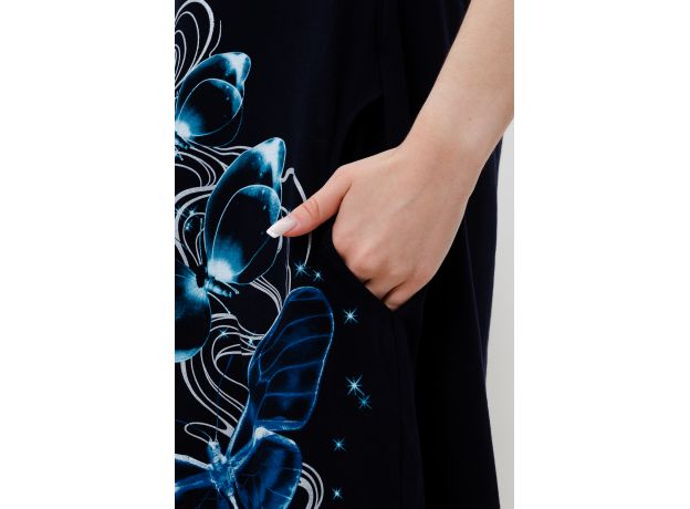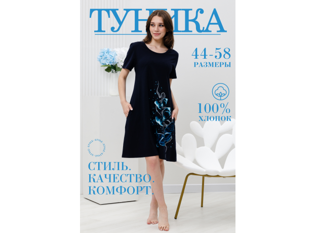 Туника женская из кулирного полотна с расклёшенным подолом книзу, горловина круглая, рукав короткий, втачной, на полочке принт, в боковых швах карманы, низ изделия обработан на плоскошовной машине. Изделие легкое в уходе. Благодаря натуральному составу ткань позволяет вашей коже дышать. Туника прекрасно подойдет для дома, дачи, прогулок и отдыха.