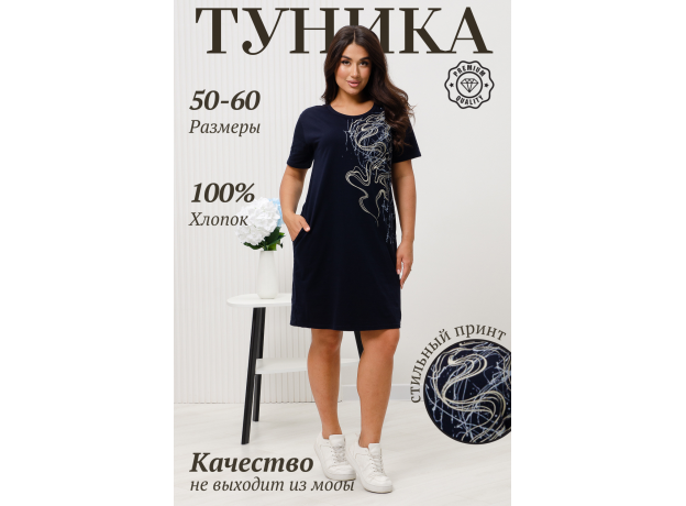 Туника из кулирного полотна, прямой силуэт, рукав короткий, на полочке принт, по бокам карманы. Легкая в уходе.