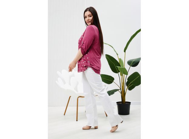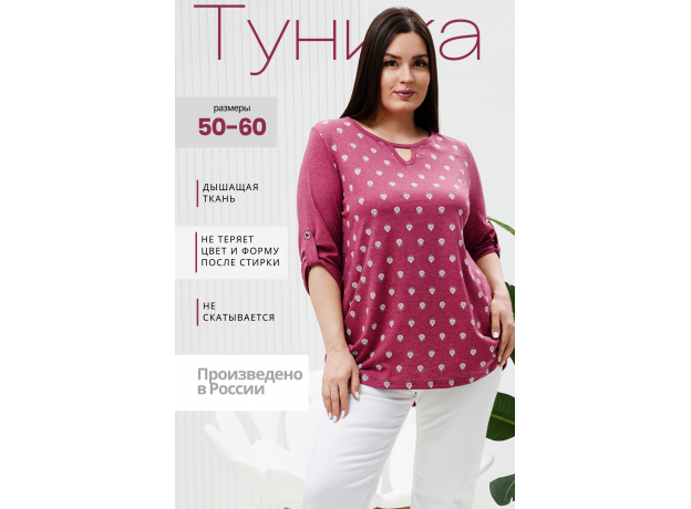 Туника женская прямого свободного кроя, состав 50% хлопок, 50% ПЭ. Горловина туники круглая с фигурной капелькой обработана окантовкой, рукав туники 3/4 с хлястиком на декоративной пуговице, низ обработан на плоскошовной машине, по бокам низа хлястики с декоративными пуговицами, на полочке печать. Туника легкая в уходе, подойдет для повседневной носки.