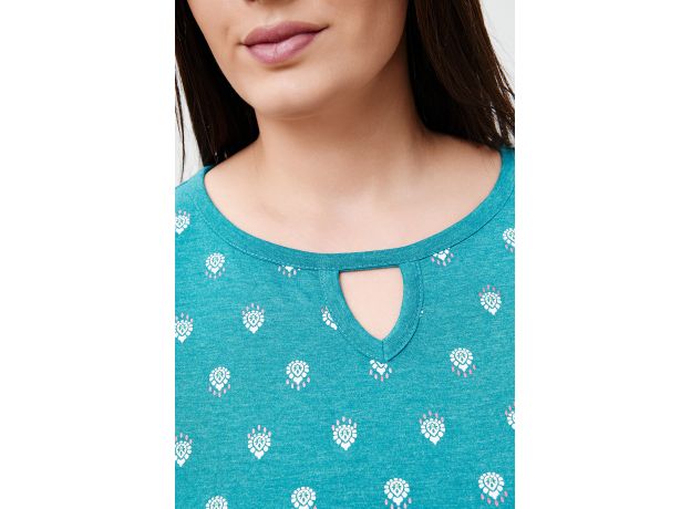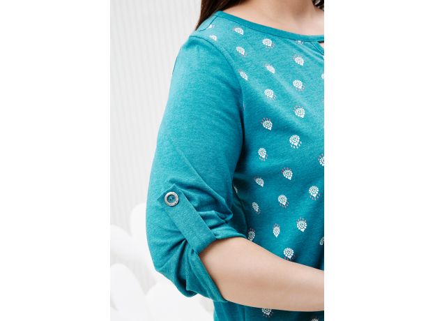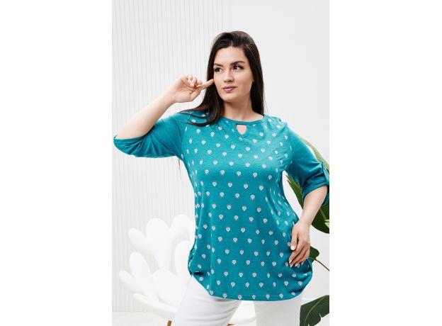 Туника женская прямого свободного кроя, состав 50% хлопок, 50% ПЭ. Горловина туники круглая с фигурной капелькой обработана окантовкой, рукав туники 3/4 с хлястиком на декоративной пуговице, низ обработан на плоскошовной машине, по бокам низа хлястики с декоративными пуговицами, на полочке печать. Туника легкая в уходе, подойдет для повседневной носки.