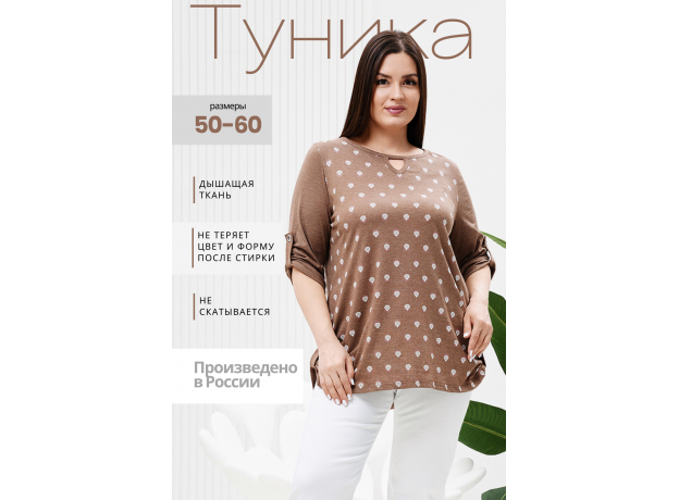 Туника женская прямого свободного кроя, состав 50% хлопок, 50% ПЭ. Горловина туники круглая с фигурной капелькой обработана окантовкой, рукав туники 3/4 с хлястиком на декоративной пуговице, низ обработан на плоскошовной машине, по бокам низа хлястики с декоративными пуговицами, на полочке печать. Туника легкая в уходе, подойдет для повседневной носки.