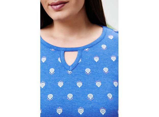 Туника женская прямого свободного кроя, состав 50% хлопок, 50% ПЭ. Горловина туники круглая с фигурной капелькой обработана окантовкой, рукав туники 3/4 с хлястиком на декоративной пуговице, низ обработан на плоскошовной машине, по бокам низа хлястики с декоративными пуговицами, на полочке печать. Туника легкая в уходе, подойдет для повседневной носки.