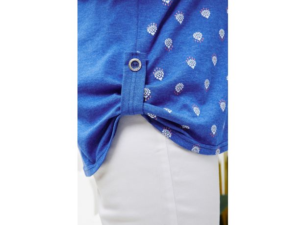 Туника женская прямого свободного кроя, состав 50% хлопок, 50% ПЭ. Горловина туники круглая с фигурной капелькой обработана окантовкой, рукав туники 3/4 с хлястиком на декоративной пуговице, низ обработан на плоскошовной машине, по бокам низа хлястики с декоративными пуговицами, на полочке печать. Туника легкая в уходе, подойдет для повседневной носки.