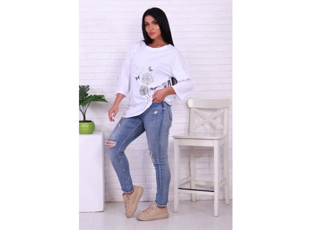 Туника выполнена из мягкого хлопка с нежным принтом одуванчиков, присыпанным глиттером. Модель свободного кроя, рукав 3/4, горловина втачная, низ и рукава вподгибку.