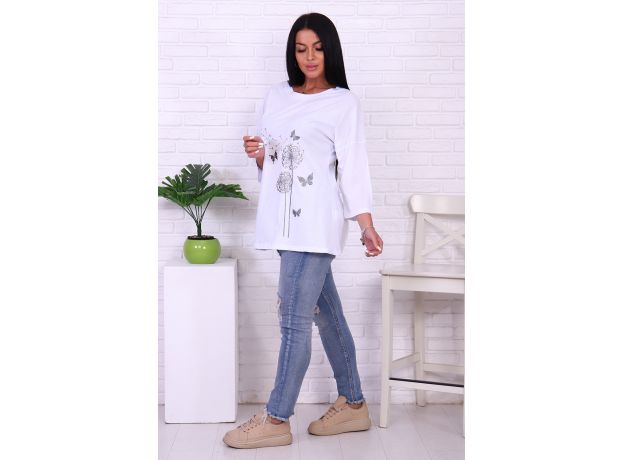 Туника выполнена из мягкого хлопка с нежным принтом одуванчиков, присыпанным глиттером. Модель свободного кроя, рукав 3/4, горловина втачная, низ и рукава вподгибку.