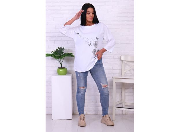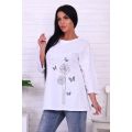 Туника выполнена из мягкого хлопка с нежным принтом одуванчиков, присыпанным глиттером. Модель свободного кроя, рукав 3/4, горловина втачная, низ и рукава вподгибку.