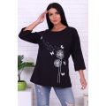 Туника выполнена из мягкого хлопка с нежным принтом одуванчиков, присыпанным глиттером. Модель свободного кроя, рукав 3/4, горловина втачная, низ и рукава вподгибку.