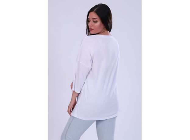 Туника изготовлена из натурального хлопка с нежным цветочным принтом, выполненным серебристым глиттером. Модель свободного кроя, рукав длиной 3/4 обработан вкруговую вподгибку, как и низ изделия, Горловина втачная из основной ткани.