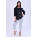 Туника изготовлена из натурального хлопка с нежным цветочным принтом, выполненным серебристым глиттером. Модель свободного кроя, рукав длиной 3/4 обработан вкруговую вподгибку, как и низ изделия, Горловина втачная из основной ткани.