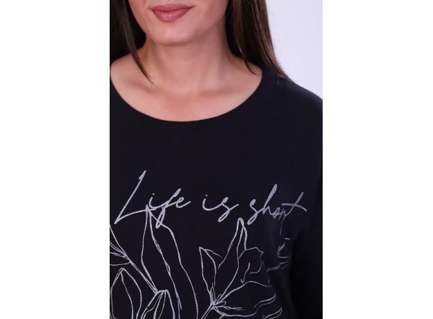 Туника изготовлена из натурального хлопка с нежным цветочным принтом, выполненным серебристым глиттером. Модель свободного кроя, рукав длиной 3/4 обработан вкруговую вподгибку, как и низ изделия, Горловина втачная из основной ткани.