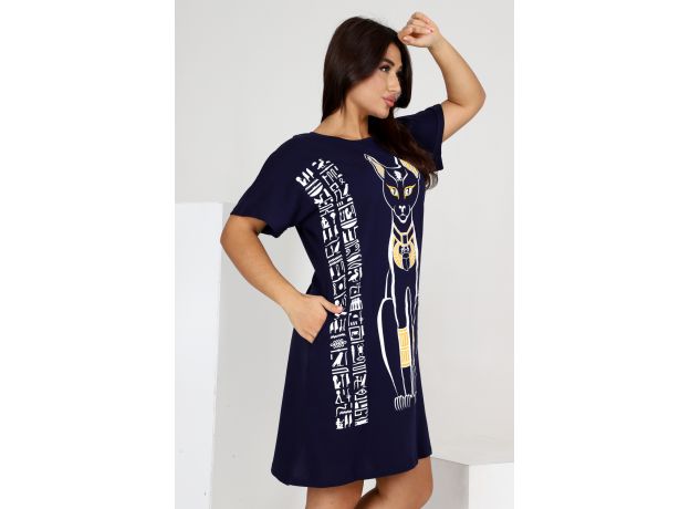 Оригинальная повседневная туника бренда Modalina из 100 % хлопка. Туника прекрасно подойдет для выхода на улицу в летнее время, прогулок на пляж и конечно, для дома, а также станет прекрасным подарком Вашим друзьям и близким. Туника полуприлегающего силуэта, рукав спущенный, короткий, круглый вырез горловины, прорезные карманы, дизайнерский принт Египетская кошка, длина изделия до колена. Данная модель отлично подойдет на любой тип фигуры и на любой возраст.  Надеемся Вы останетесь довольны покупкой! Мы работаем для Вас! Возможны расхождения в оттенках представленных на сайте.