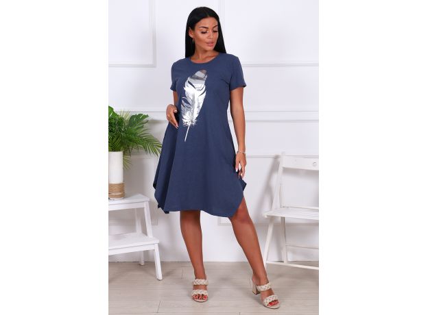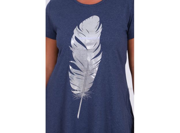 Туника с блестящим принтом в виде большого пера. Туника из трикотажной кулирки, смесовой состав обеспечивает комфортную эластичность изделия. Рукава короткие. Расклёшенный силуэт с фигурными разрезами снизу в боковых швах.