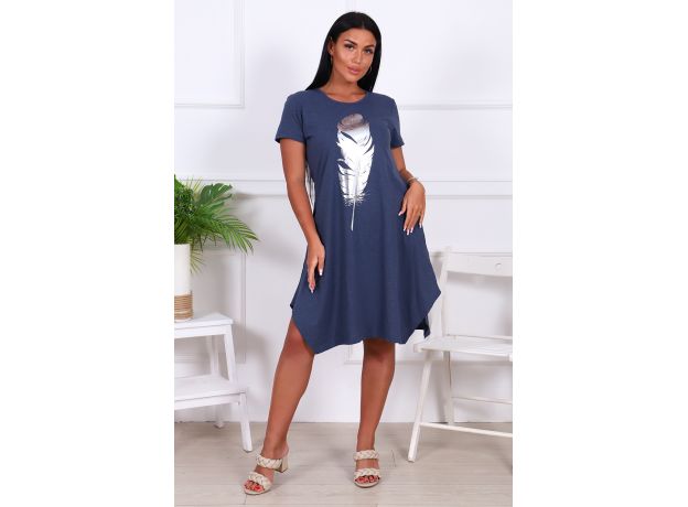 Туника с блестящим принтом в виде большого пера. Туника из трикотажной кулирки, смесовой состав обеспечивает комфортную эластичность изделия. Рукава короткие. Расклёшенный силуэт с фигурными разрезами снизу в боковых швах.