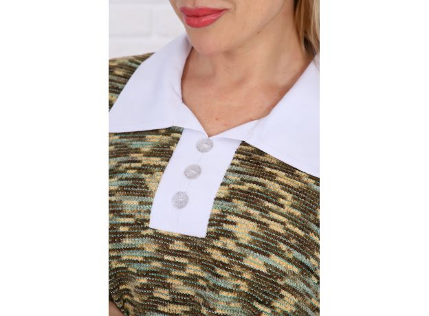 Туника женская, силуэт трапеция. Рубашечный воротник, короткий рукав подобран на паты с пуговицей. На передней полочке украшение в виде пуговиц. Легкая, удобная, практичная.