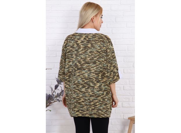 Туника женская, силуэт трапеция. Рубашечный воротник, короткий рукав подобран на паты с пуговицей. На передней полочке украшение в виде пуговиц. Легкая, удобная, практичная.