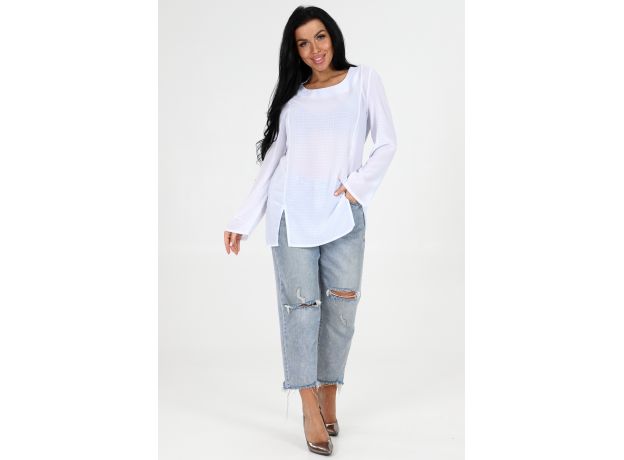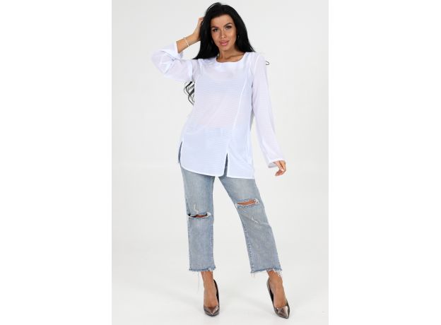 Женская туника прямого кроя. Округлая горловина, длинный рукав. На передней полочке разрезы снизу. Туника имеет два образа, первый: с тремя пуговицами рядом с горловиной; второй: без пуговиц. Данная модель легкая и удобная, подойдет для повседневной носки.