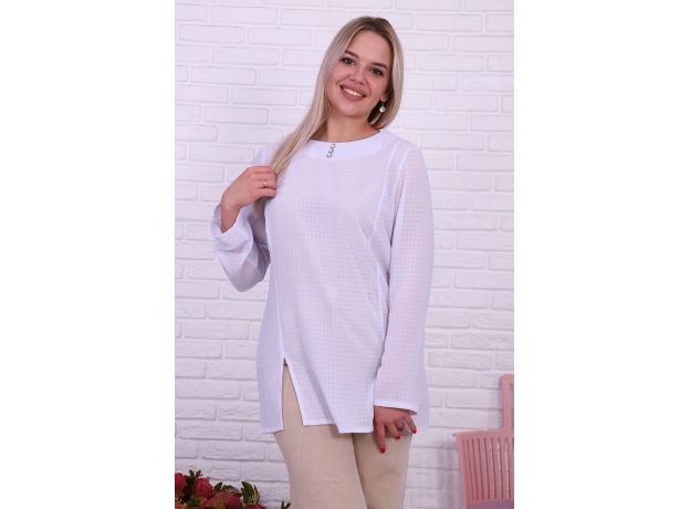 Женская туника прямого кроя. Округлая горловина, длинный рукав. На передней полочке разрезы снизу. Туника имеет два образа, первый: с тремя пуговицами рядом с горловиной; второй: без пуговиц. Данная модель легкая и удобная, подойдет для повседневной носки.