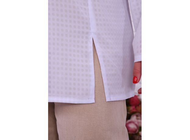 Женская туника прямого кроя. Округлая горловина, длинный рукав. На передней полочке разрезы снизу. Туника имеет два образа, первый: с тремя пуговицами рядом с горловиной; второй: без пуговиц. Данная модель легкая и удобная, подойдет для повседневной носки.