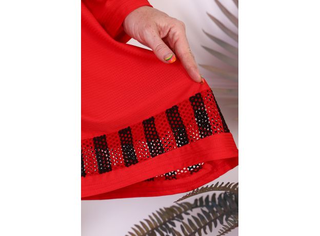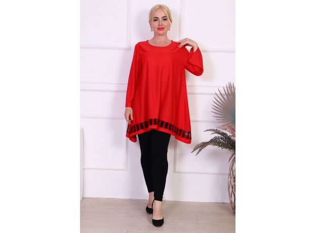 Элегантная женская туника  формы трапеция. Цельнокроеная  расклешенная полочка делает изделие легким и свободным. Округлый ворот и длинный рукав. По низу изделия вшита лента из материала сетка.