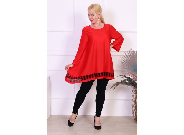 Элегантная женская туника формы трапеция. Цельнокроеная расклешенная полочка делает изделие легким и свободным. Округлый ворот и длинный рукав. По низу изделия вшита лента из материала сетка. Удобно и практично.
