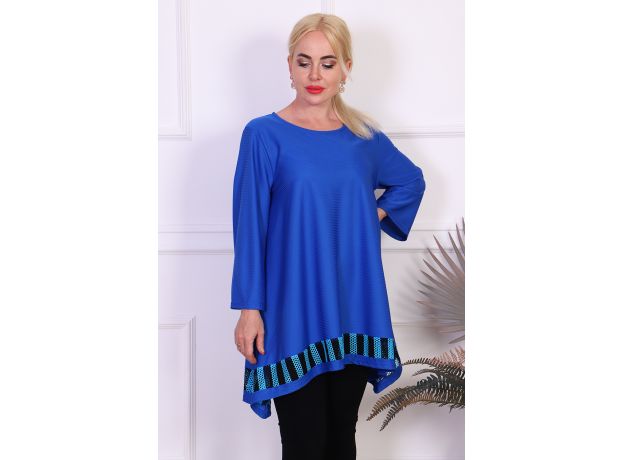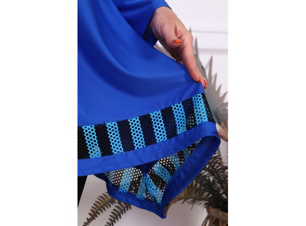 Элегантная женская туника формы трапеция. Цельнокроеная расклешенная полочка делает изделие легким и свободным. Округлый ворот и длинный рукав. По низу изделия вшита лента из материала сетка. Удобно и практично.