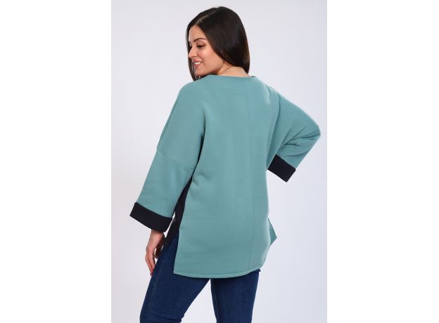 Туника комбинированная прямого силуэта. Спущенный рукав 3/4 на манжете, длина рукава от шва. Округлый воротник, на передней полочке карман, декорирован брошью. На левом плече декор из 2-х пуговиц. Задняя полочка длиннее передней. Тепло и удобно.