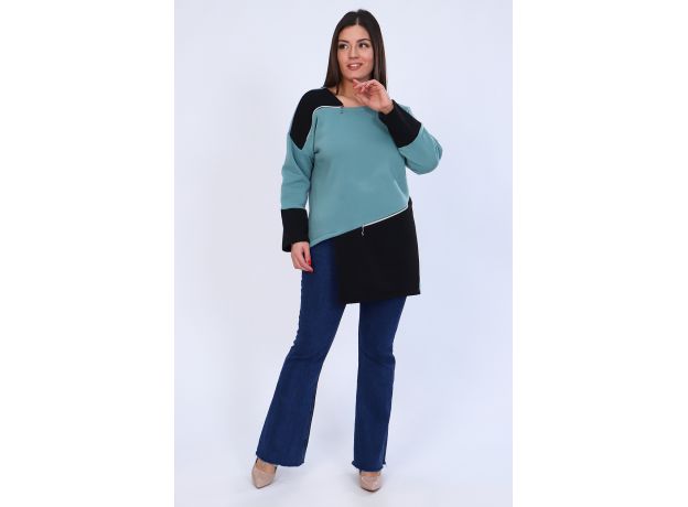 Туника женская, комбинированная, прямого силуэта, спущенный рукав 3/4 с широкими манжетами, длина рукава от шва. Горловина с обтачкой, справа декорирована втачной молнией. Фигурный v-образный низ декорирован вшивной молнией. Удобно и практично.