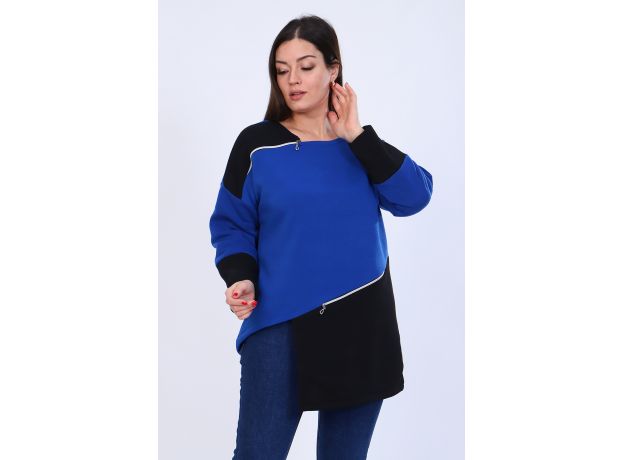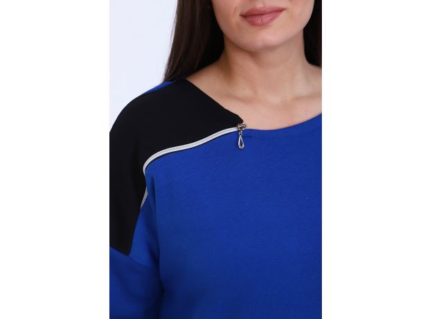 Туника женская, комбинированная, прямого силуэта, спущенный рукав 3/4 с широкими манжетами, длина рукава от шва. Горловина с обтачкой, справа декорирована втачной молнией. Фигурный v-образный низ декорирован вшивной молнией. Удобно и практично.