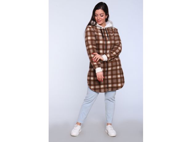 Туника женская прямого силуэта на молнии, с капюшоном на шнуровке через люверсы. Длинный рукав на манжете. Закругленный низ полочек.