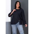 Туника женская прямого силуэта, длинный рукав без манжетов, с разрезом снизу, декорирован двумя пуговицами. Округлая горловина. На передней полочке рельефная полоса слева, снизу разрез, декорирован двумя пуговицами, справа на передней полочке вытачка. Удобно и практично. Рост модели на фото 164 см, размер 48