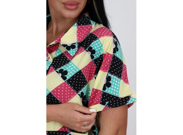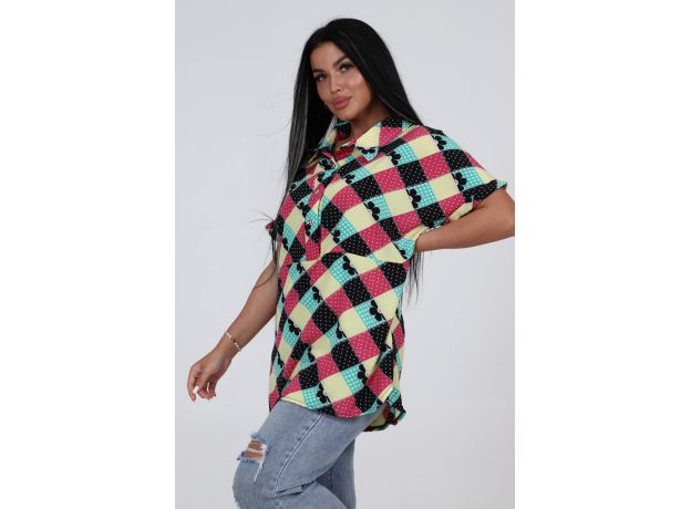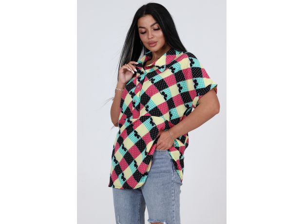 Туника женская прямого силуэта с спущенным коротким рукавом на манжете. Воротник рубашечного типа, на передней полочке планка декорирована тремя пуговицами .Легкая и удобная.
