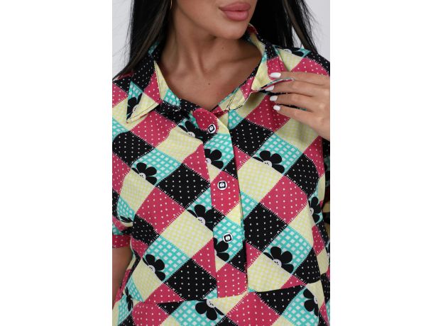 Туника женская прямого силуэта с спущенным коротким рукавом на манжете. Воротник рубашечного типа, на передней полочке планка декорирована тремя пуговицами .Легкая и удобная.