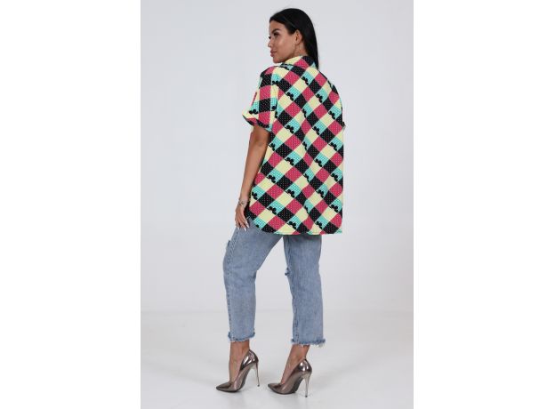 Туника женская прямого силуэта с спущенным коротким рукавом на манжете. Воротник рубашечного типа, на передней полочке планка декорирована тремя пуговицами .Легкая и удобная.
