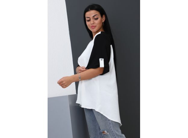 Туника женская комбинированная, расклешенного типа, рукав 3/4,V-образный воротник. Задняя полочка длиннее передней. Легкая и удобная.