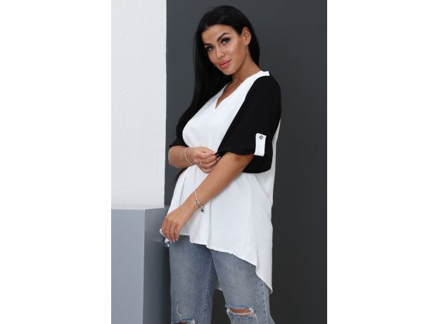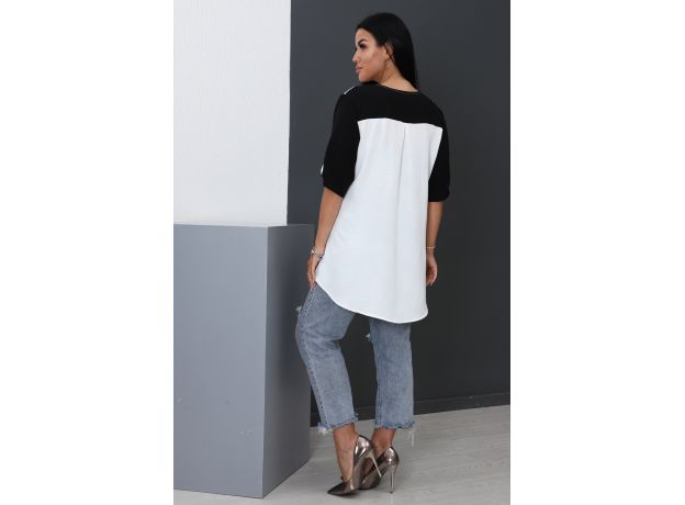 Туника женская комбинированная, расклешенного типа, рукав 3/4,V-образный воротник. Задняя полочка длиннее передней. Легкая и удобная.