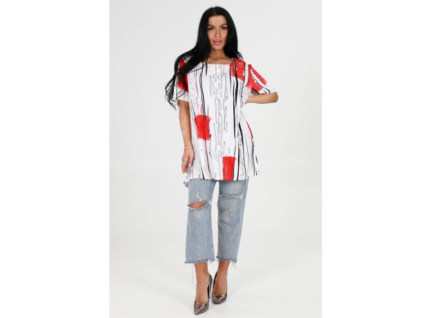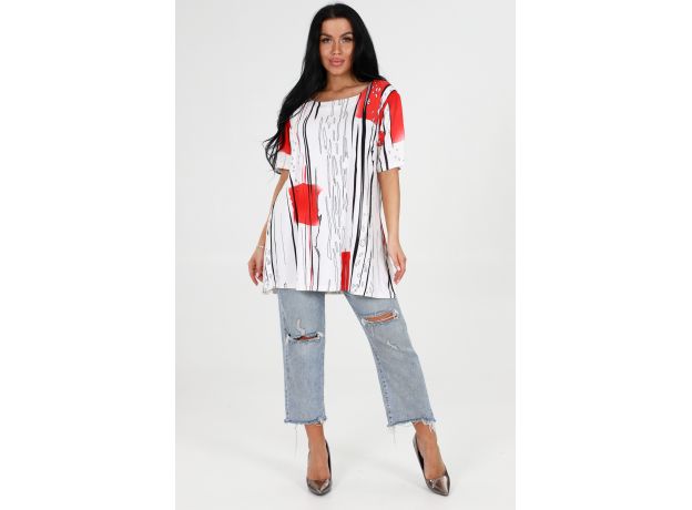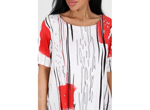 Туника женская свободного кроя. У туники короткий рукав и округлая горловина. Изделие имеет фигурный низ, А-силуэт. Наша туника легкая и удобная, подойдет для повседневной носки.