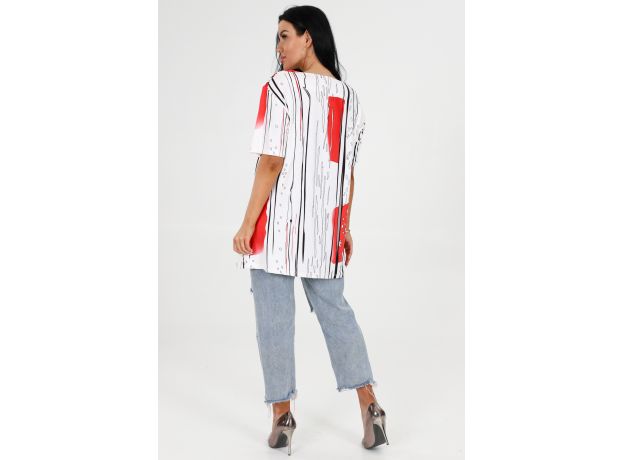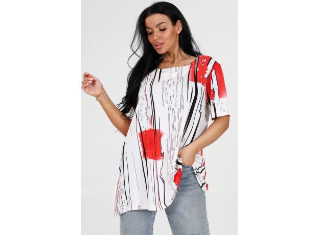 Туника женская свободного кроя. У туники короткий рукав и округлая горловина. Изделие имеет фигурный низ, А-силуэт. Наша туника легкая и удобная, подойдет для повседневной носки.