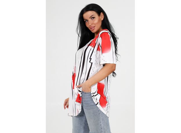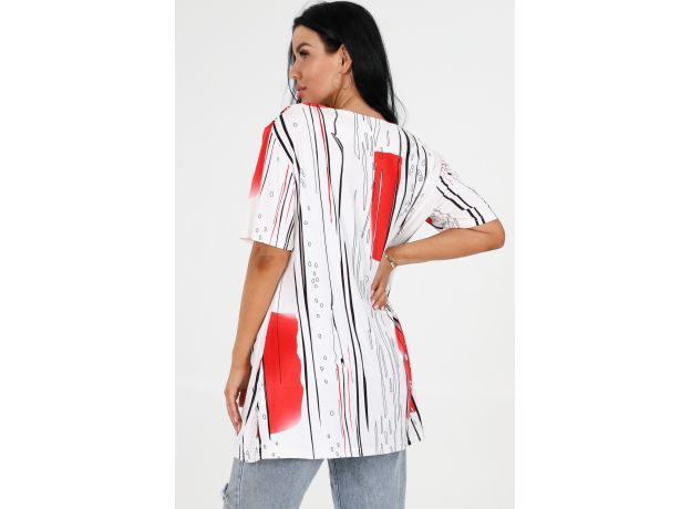 Туника женская свободного кроя. У туники короткий рукав и округлая горловина. Изделие имеет фигурный низ, А-силуэт. Наша туника легкая и удобная, подойдет для повседневной носки.