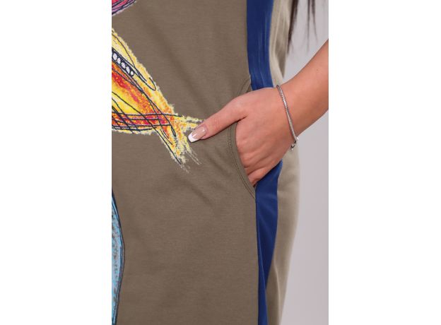Туника женская, выполнена из трикотажного полотна, 100% хлопок. Горловина круглой формы, с боковыми карманами и ярким принтом. Рукава и бока оформлены вставками из контрастной ткани.