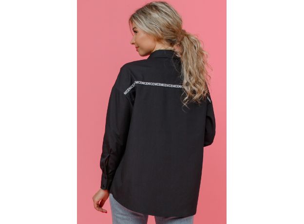 Рубашка оверсайз на пуговицах, с воротником, рукав длинный с манжетом, низ рубашки закругленный (спинка на 2 см длиннее полочки), 2 кармана на груди, на левом кармане и на кокетке на спине нашита отделочная черно-белая лента. Длина рукава измерена от плечевого шва