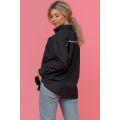 Рубашка оверсайз на пуговицах, с воротником, рукав длинный с манжетом, низ рубашки закругленный (спинка на 2 см длиннее полочки), 2 кармана на груди, на левом кармане и на кокетке на спине нашита отделочная черно-белая лента. Длина рукава измерена от плечевого шва