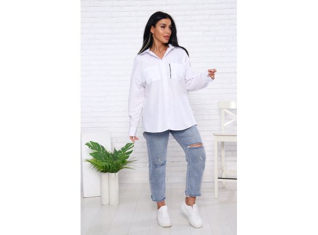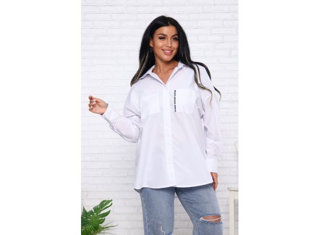 Рубашка женская оверсайз на пуговицах, с воротником, рукав длинный с манжетом, низ рубашки закругленный (спинка на 2 см длиннее полочки), 2 кармана на груди, на левом кармане и на кокетке на спине нашита отделочная репсовая лента с печатью (внимание! Утюжить с изнанки). Длина рукава измерена от плечевого шва.