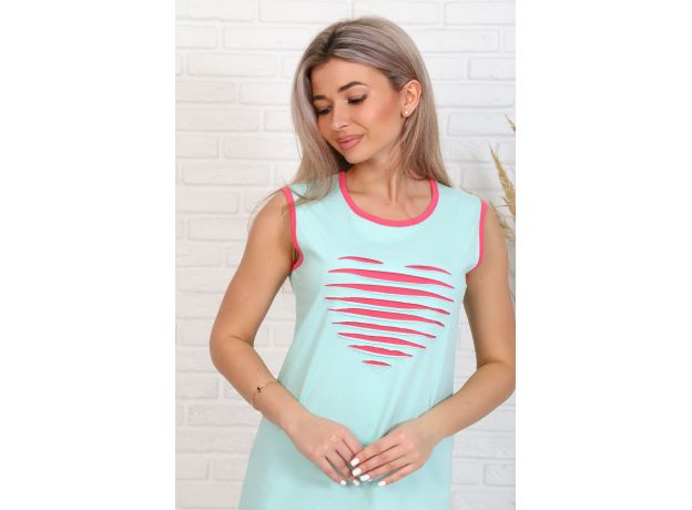 Туника из кулирки. Низ изделия, проймы рукава, разрезы и горловина окантованы в цвет отделочного полотна. На полочке стилизованное изображение сердца из разрезов.