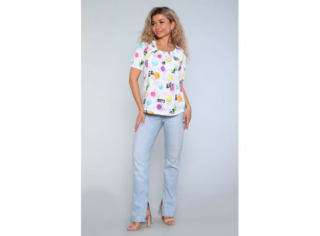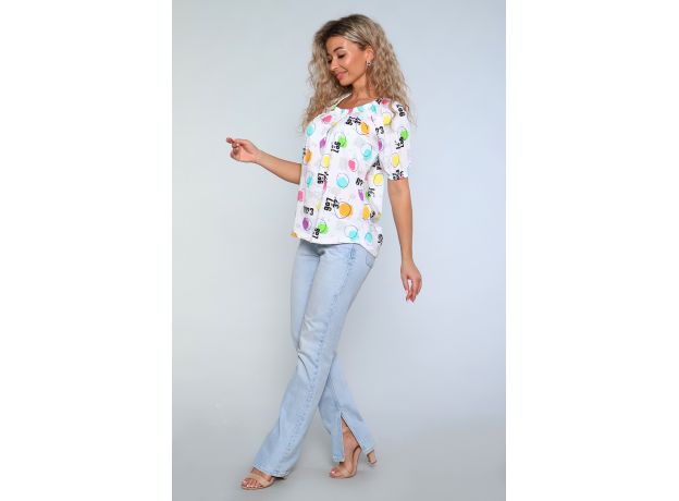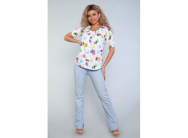 Туника полуприлегающего силуэта с короткими рукавами - реглан и полукруглым низом. Горловина и низ рукавов обработаны с эластичной тесьмой. Комфортна для повседневной носки.