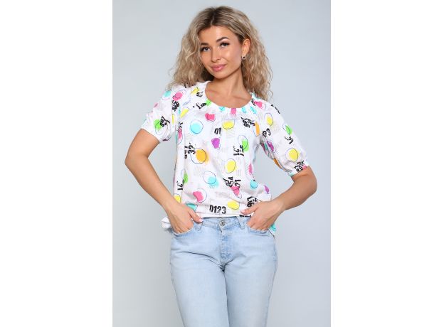 Туника полуприлегающего силуэта с короткими рукавами - реглан и полукруглым низом. Горловина и низ рукавов обработаны с эластичной тесьмой. Комфортна для повседневной носки.