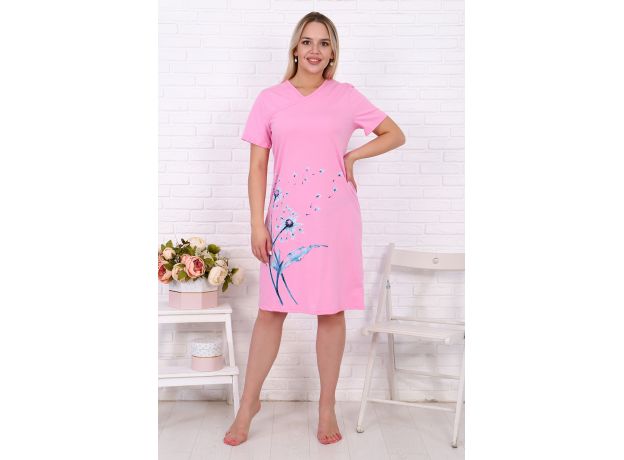 Туника женская из хлопкового трикотажного полотна со стильным принтом на полочке в виде одуванчиков. Рукава короткие на подгибке, горловина обработана кантом, отлично подойдет как для повседневной носки, так и для отдыха дома