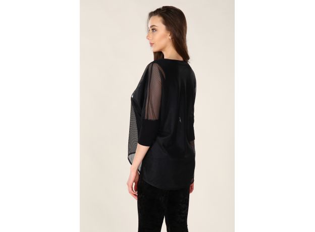 Стильная, лёгкая и приятная на ощупь туника состоит из двух частей: верхней - из сетки с рукавом летучая мышь длиной 3/4 и нижней - из вискозы с фольгированным принтом, соединяющихся между собой по горловине. Она является одной из наиболее популярных моделей, которая отличается высокой стойкостью к износу, воздухопроницаемостью, гигроскопичностью и обеспечивает максимальный комфорт в жаркую погоду.