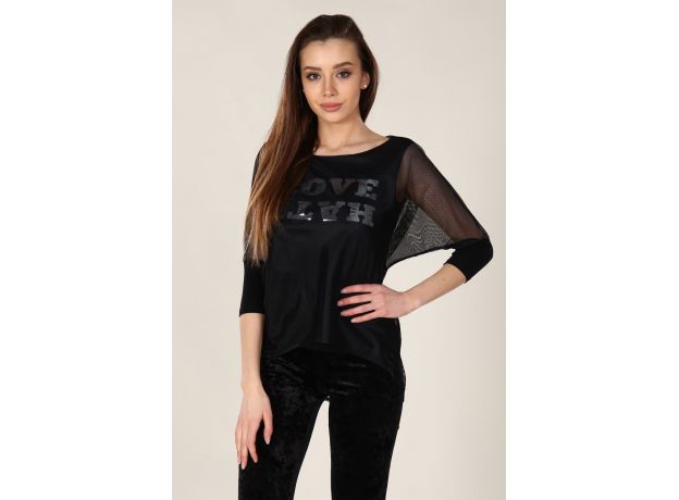 Стильная, лёгкая и приятная на ощупь туника состоит из двух частей: верхней - из сетки с рукавом летучая мышь длиной 3/4 и нижней - из вискозы с фольгированным принтом