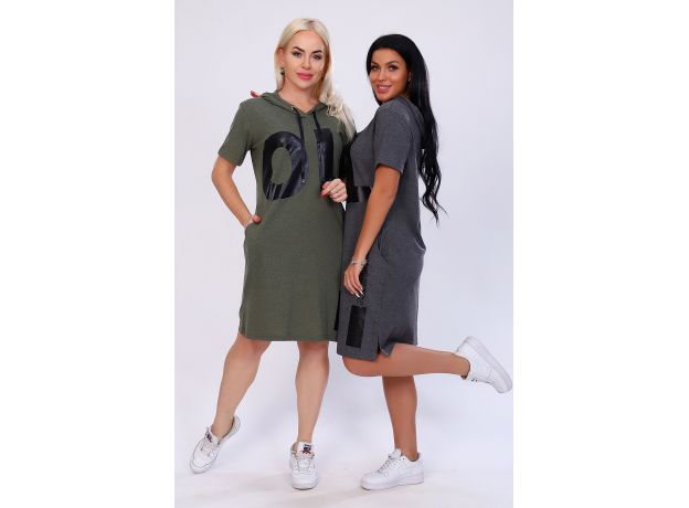 Женская туника из легкого трикотажного материала тонкого хлопка - кулирки. Свободная, спортивная, с капюшоном - её вполне можно использовать как летний вечерний костюм, как повседневный домашний наряд или как легкое праздничное или офисное платье. Благодаря свободному крою, туника отлично подойдет полным и пышным женщинам, беременным девушкам и кормящим мамам. Модный, нарядный черный принт в виде крупных и мелких латинских букв актуален всегда и придает изделию особый шик. Карманы спрятаны в боковых швах для вашего удобства.