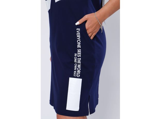 Женская туника из легкого трикотажного материала тонкого хлопка - кулирки. Свободная, спортивная, с капюшоном - её вполне можно использовать как летний вечерний костюм, как повседневный домашний наряд или как легкое праздничное или офисное платье. Благодаря свободному крою, туника отлично подойдет полным и пышным женщинам, беременным девушкам и кормящим мамам. Модный, нарядный черный принт в виде крупных и мелких латинских букв актуален всегда и придает изделию особый шик. Карманы спрятаны в боковых швах для вашего удобства.